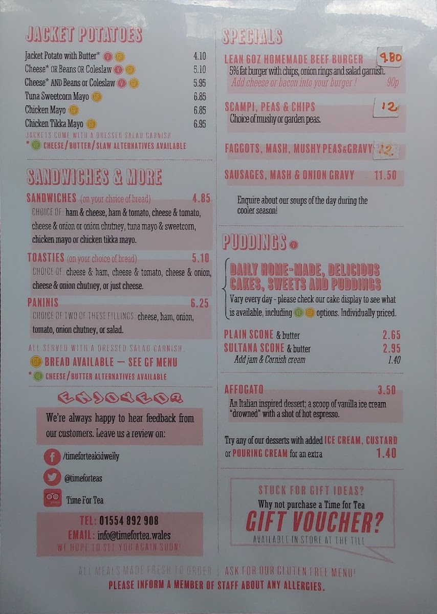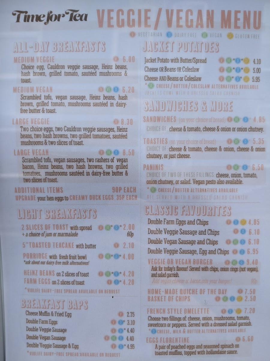 Time for Tea offers a straightforward and inviting café menu that suits relaxed mornings, light lunches, and casual catch-ups. The selection revolves around comforting classics and familiar favourites, perfect for settling in with a warm drink or enjoying a bite that feels like home.